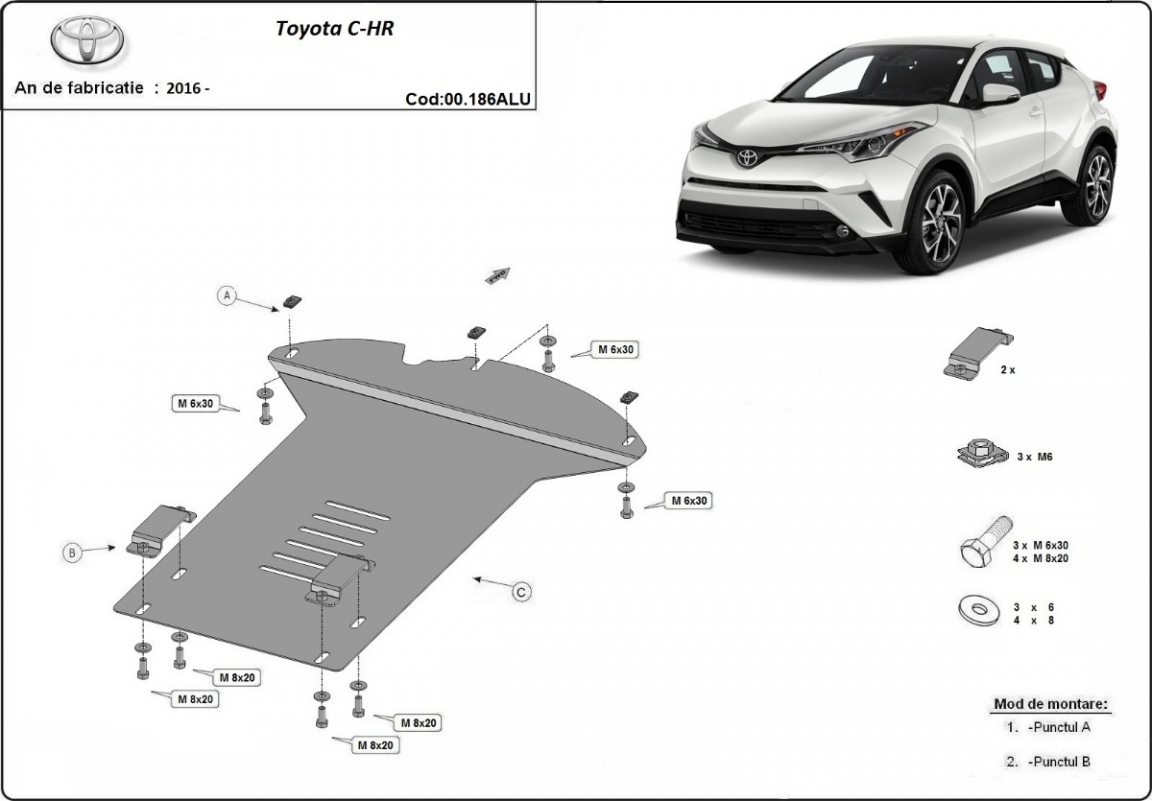 Die Abschirmung schützt: Katalysator Toyota C-HR - 2016 und 2023. Der Unterfahrschutz ist neu und passt perfekt für alle Toyota C-HR versionen, die zwischen 2016 und 2023 hergestellt wurden. Aus Aluminiumblech angefertigt mit einer Stärke von 3 mm. Die Schilde bestehen aus Aluminium, aber die Befestigungshalterungen bestehen aus Stahl. Schrauben, Mutter, Klips - alle Befestigungszubehör sind im Lieferung enthalten. Um mehr Schutz zu bieten gegen Korrosion wird der Unterfahrschutz elektrostatisch besprüht (Pulverbeschichtet) und bei 200o eingebrannt bzw. getrocknet. |