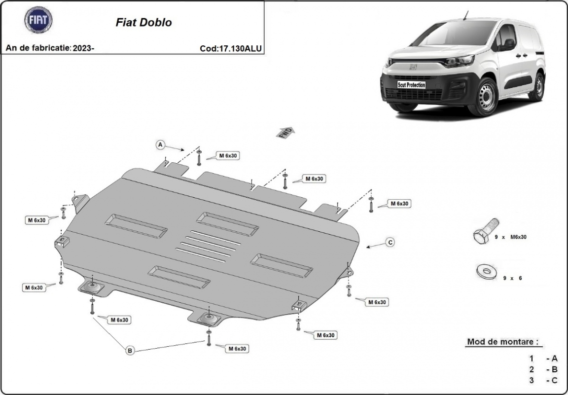 Die Abschirmung schützt: motor, getriebe, kühler, vordere stossfänger Fiat Doblo - 2023 und 2026. Der Unterfahrschutz ist neu und passt perfekt für alle Fiat Doblo versionen, die zwischen 2023 und 2026 hergestellt wurden. Aus Aluminiumblech angefertigt mit einer Stärke von 3 mm. Die Schilde bestehen aus Aluminium, aber die Befestigungshalterungen bestehen aus Stahl. Schrauben, Mutter, Klips - alle Befestigungszubehör sind im Lieferung enthalten. Um mehr Schutz zu bieten gegen Korrosion wird der Unterfahrschutz elektrostatisch besprüht (Pulverbeschichtet) und bei 200o eingebrannt bzw. getrocknet. |