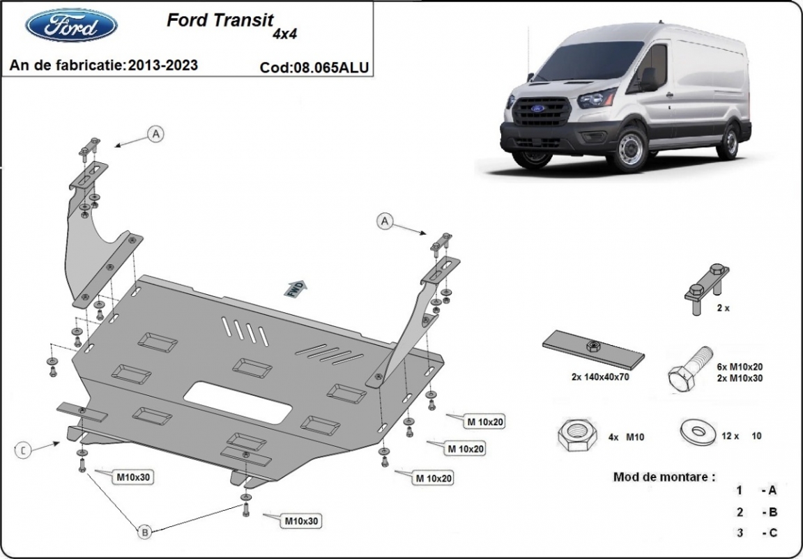 Die Abschirmung schützt: motor, getriebe, kühler Ford Transit 4x4 - 2013 und 2023. Der Unterfahrschutz ist neu und passt perfekt für alle Ford Transit 4x4 versionen, die zwischen 2013 und 2023 hergestellt wurden. Aus Aluminiumblech angefertigt mit einer Stärke von 3 mm. Die Schilde bestehen aus Aluminium, aber die Befestigungshalterungen bestehen aus Stahl. Schrauben, Mutter, Klips - alle Befestigungszubehör sind im Lieferung enthalten. Um mehr Schutz zu bieten gegen Korrosion wird der Unterfahrschutz elektrostatisch besprüht (Pulverbeschichtet) und bei 200o eingebrannt bzw. getrocknet. |