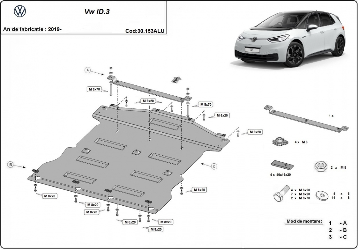 Die Abschirmung schützt: motor, getriebe, kühler Volkswagen ID.3 - 2019 und 2026. Der Unterfahrschutz ist neu und passt perfekt für alle Volkswagen ID.3 versionen, die zwischen 2019 und 2026 hergestellt wurden. Aus Aluminiumblech angefertigt mit einer Stärke von 3 mm. Die Schilde bestehen aus Aluminium, aber die Befestigungshalterungen bestehen aus Stahl. Schrauben, Mutter, Klips - alle Befestigungszubehör sind im Lieferung enthalten. Um mehr Schutz zu bieten gegen Korrosion wird der Unterfahrschutz elektrostatisch besprüht (Pulverbeschichtet) und bei 200o eingebrannt bzw. getrocknet. |