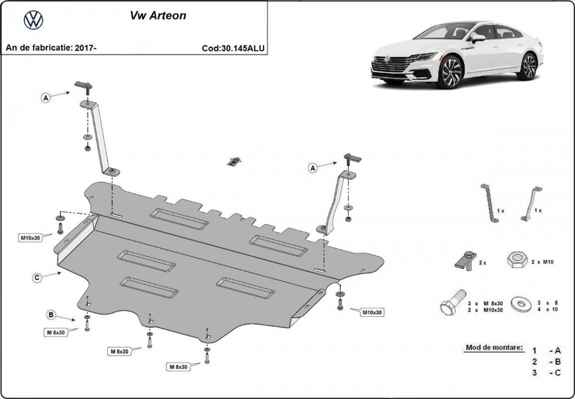 Die Abschirmung schützt: motor, getriebe, kühler, vordere stossfänger VW Arteon - 2017 und 2026. Der Unterfahrschutz ist neu und passt perfekt für alle VW Arteon versionen, die zwischen 2017 und 2026 hergestellt wurden. Aus Aluminiumblech angefertigt mit einer Stärke von 3 mm. Die Schilde bestehen aus Aluminium, aber die Befestigungshalterungen bestehen aus Stahl. Schrauben, Mutter, Klips - alle Befestigungszubehör sind im Lieferung enthalten. Um mehr Schutz zu bieten gegen Korrosion wird der Unterfahrschutz elektrostatisch besprüht (Pulverbeschichtet) und bei 200o eingebrannt bzw. getrocknet. |