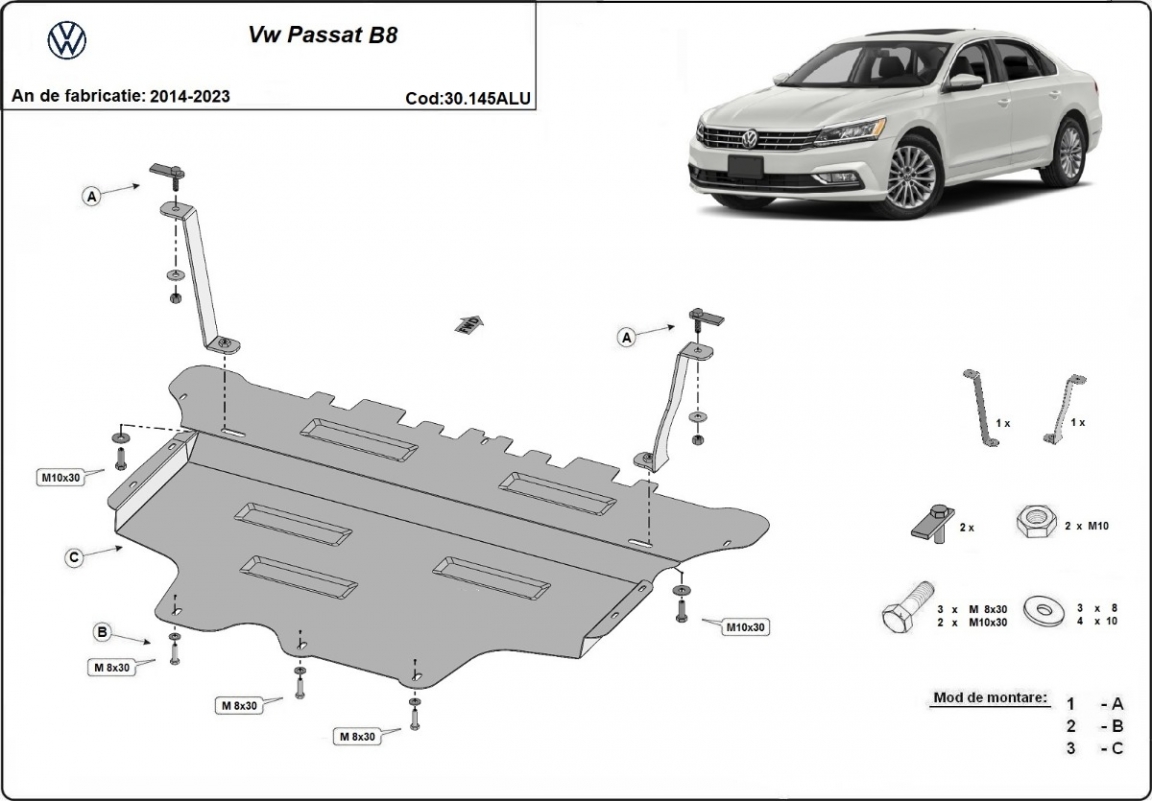 Die Abschirmung schützt: motor, getriebe, kühler, vordere stossfänger VW Passat B8 - 2014 und 2023. Der Unterfahrschutz ist neu und passt perfekt für alle VW Passat B8 versionen, die zwischen 2014 und 2023 hergestellt wurden. Aus Aluminiumblech angefertigt mit einer Stärke von 3 mm. Die Schilde bestehen aus Aluminium, aber die Befestigungshalterungen bestehen aus Stahl. Schrauben, Mutter, Klips - alle Befestigungszubehör sind im Lieferung enthalten. Um mehr Schutz zu bieten gegen Korrosion wird der Unterfahrschutz elektrostatisch besprüht (Pulverbeschichtet) und bei 200o eingebrannt bzw. getrocknet. |