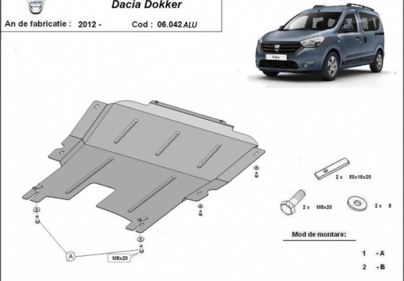 Die Abschirmung schützt: motor, getriebe Dacia Dokker - 2012 und 2026. Der Unterfahrschutz ist neu und passt perfekt für alle Dacia Dokker versionen, die zwischen 2012 und 2026 hergestellt wurden. Aus Aluminiumblech angefertigt mit einer Stärke von 4 mm. Die Schilde bestehen aus Aluminium, aber die Befestigungshalterungen bestehen aus Stahl. Schrauben, Mutter, Klips - alle Befestigungszubehör sind im Lieferung enthalten. Um mehr Schutz zu bieten gegen Korrosion wird der Unterfahrschutz elektrostatisch besprüht (Pulverbeschichtet) und bei 200o eingebrannt bzw. getrocknet. |