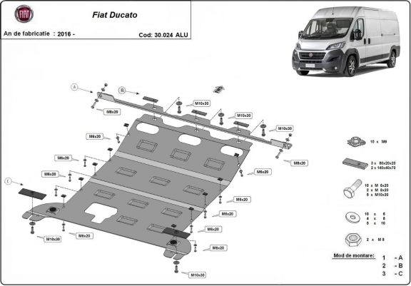 Die Abschirmung schützt: motor, getriebe, kühler Fiat Ducato - 2016 und 2026. Der Unterfahrschutz ist neu und passt perfekt für alle Fiat Ducato versionen, die zwischen 2016 und 2026 hergestellt wurden. Aus Aluminiumblech angefertigt mit einer Stärke von 4 mm. Die Schilde bestehen aus Aluminium, aber die Befestigungshalterungen bestehen aus Stahl. Schrauben, Mutter, Klips - alle Befestigungszubehör sind im Lieferung enthalten. Um mehr Schutz zu bieten gegen Korrosion wird der Unterfahrschutz elektrostatisch besprüht (Pulverbeschichtet) und bei 200o eingebrannt bzw. getrocknet. |