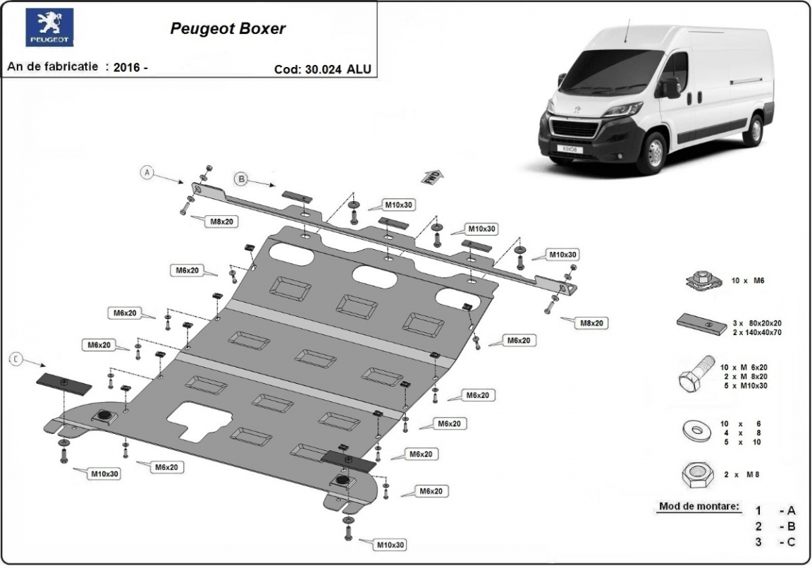 Die Abschirmung schützt: motor, getriebe, kühler Peugeot Boxer - 2016 und 2026. Der Unterfahrschutz ist neu und passt perfekt für alle Peugeot Boxer versionen, die zwischen 2016 und 2026 hergestellt wurden. Aus Aluminiumblech angefertigt mit einer Stärke von 4 mm. Die Schilde bestehen aus Aluminium, aber die Befestigungshalterungen bestehen aus Stahl. Schrauben, Mutter, Klips - alle Befestigungszubehör sind im Lieferung enthalten. Um mehr Schutz zu bieten gegen Korrosion wird der Unterfahrschutz elektrostatisch besprüht (Pulverbeschichtet) und bei 200o eingebrannt bzw. getrocknet. |