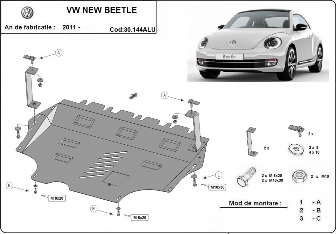 Die Abschirmung schützt: motor, getriebe, kühler Volkswagen New Beetle - 2011 und 2017. Der Unterfahrschutz ist neu und passt perfekt für alle Volkswagen New Beetle versionen, die zwischen 2011 und 2017 hergestellt wurden. Aus Aluminiumblech angefertigt mit einer Stärke von 3 mm. Die Schilde bestehen aus Aluminium, aber die Befestigungshalterungen bestehen aus Stahl. Schrauben, Mutter, Klips - alle Befestigungszubehör sind im Lieferung enthalten. Um mehr Schutz zu bieten gegen Korrosion wird der Unterfahrschutz elektrostatisch besprüht (Pulverbeschichtet) und bei 200o eingebrannt bzw. getrocknet. |