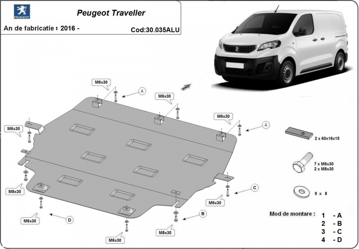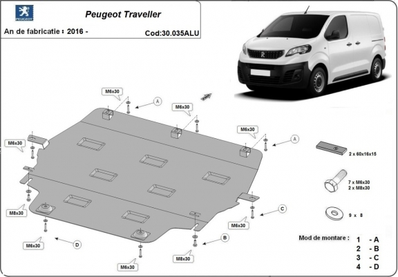 Die Abschirmung schützt: motor, getriebe, kühler Peugeot Traveller - 2016 und 2026. Der Unterfahrschutz ist neu und passt perfekt für alle Peugeot Traveller versionen, die zwischen 2016 und 2026 hergestellt wurden. Aus Aluminiumblech angefertigt mit einer Stärke von 3 mm. Die Schilde bestehen aus Aluminium, aber die Befestigungshalterungen bestehen aus Stahl. Schrauben, Mutter, Klips - alle Befestigungszubehör sind im Lieferung enthalten. Um mehr Schutz zu bieten gegen Korrosion wird der Unterfahrschutz elektrostatisch besprüht (Pulverbeschichtet) und bei 200o eingebrannt bzw. getrocknet. |