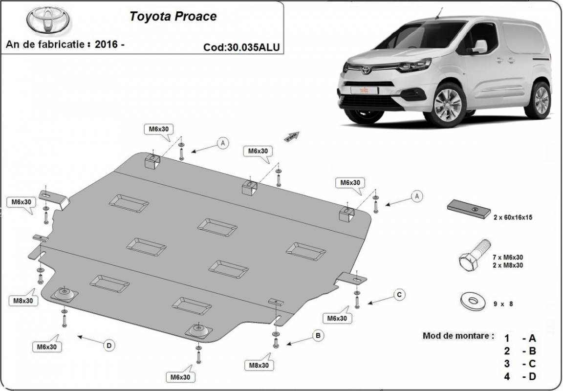 Die Abschirmung schützt: motor, getriebe, kühler Toyota Proace - 2016 und 2026. Der Unterfahrschutz ist neu und passt perfekt für alle Toyota Proace versionen, die zwischen 2016 und 2026 hergestellt wurden. Aus Aluminiumblech angefertigt mit einer Stärke von 3 mm. Die Schilde bestehen aus Aluminium, aber die Befestigungshalterungen bestehen aus Stahl. Schrauben, Mutter, Klips - alle Befestigungszubehör sind im Lieferung enthalten. Um mehr Schutz zu bieten gegen Korrosion wird der Unterfahrschutz elektrostatisch besprüht (Pulverbeschichtet) und bei 200o eingebrannt bzw. getrocknet. |