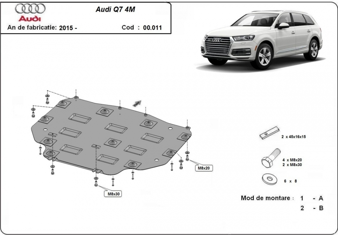 Die Abschirmung schützt: getriebe Audi Q7 - 2015 und 2026. Der Unterfahrschutz ist neu und passt perfekt für alle Audi Q7 versionen, die zwischen 2015 und 2026 hergestellt wurden. Aus Stahlblech angefertigt mit einer Stärke von 2 mm. Schrauben, Mutter, Klips - alle Befestigungszubehör sind im Lieferung enthalten. Um mehr Schutz zu bieten gegen Korrosion wird der Unterfahrschutz elektrostatisch besprüht (Pulverbeschichtet) und bei 200o eingebrannt bzw. getrocknet. |