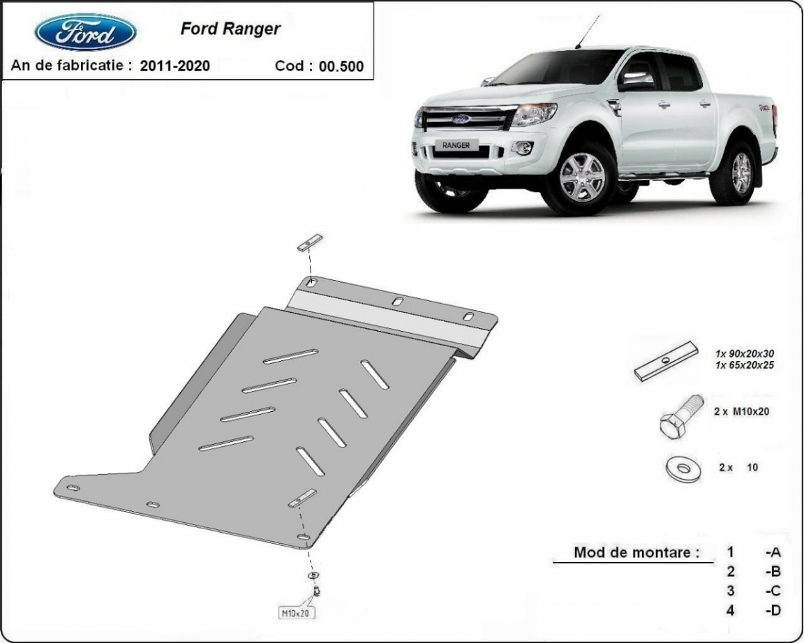 Die Abschirmung schützt: getriebe Ford Ranger - 2011 und 2020. Der Unterfahrschutz ist neu und passt perfekt für alle Ford Ranger versionen, die zwischen 2011 und 2020 hergestellt wurden. Aus Stahlblech angefertigt mit einer Stärke von 3 mm. Schrauben, Mutter, Klips - alle Befestigungszubehör sind im Lieferung enthalten. Um mehr Schutz zu bieten gegen Korrosion wird der Unterfahrschutz elektrostatisch besprüht (Pulverbeschichtet) und bei 200o eingebrannt bzw. getrocknet. |
