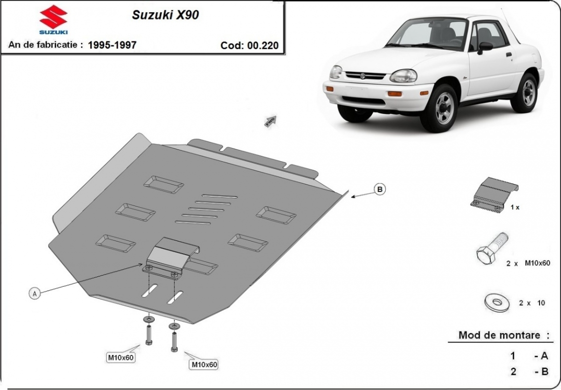 Die Abschirmung schützt: getriebe Suzuki X90 - 1988 und 1999. Der Unterfahrschutz ist neu und passt perfekt für alle Suzuki X90 versionen, die zwischen 1988 und 1999 hergestellt wurden. Aus Stahlblech angefertigt mit einer Stärke von 3 mm. Schrauben, Mutter, Klips - alle Befestigungszubehör sind im Lieferung enthalten. Um mehr Schutz zu bieten gegen Korrosion wird der Unterfahrschutz elektrostatisch besprüht (Pulverbeschichtet) und bei 200o eingebrannt bzw. getrocknet. |