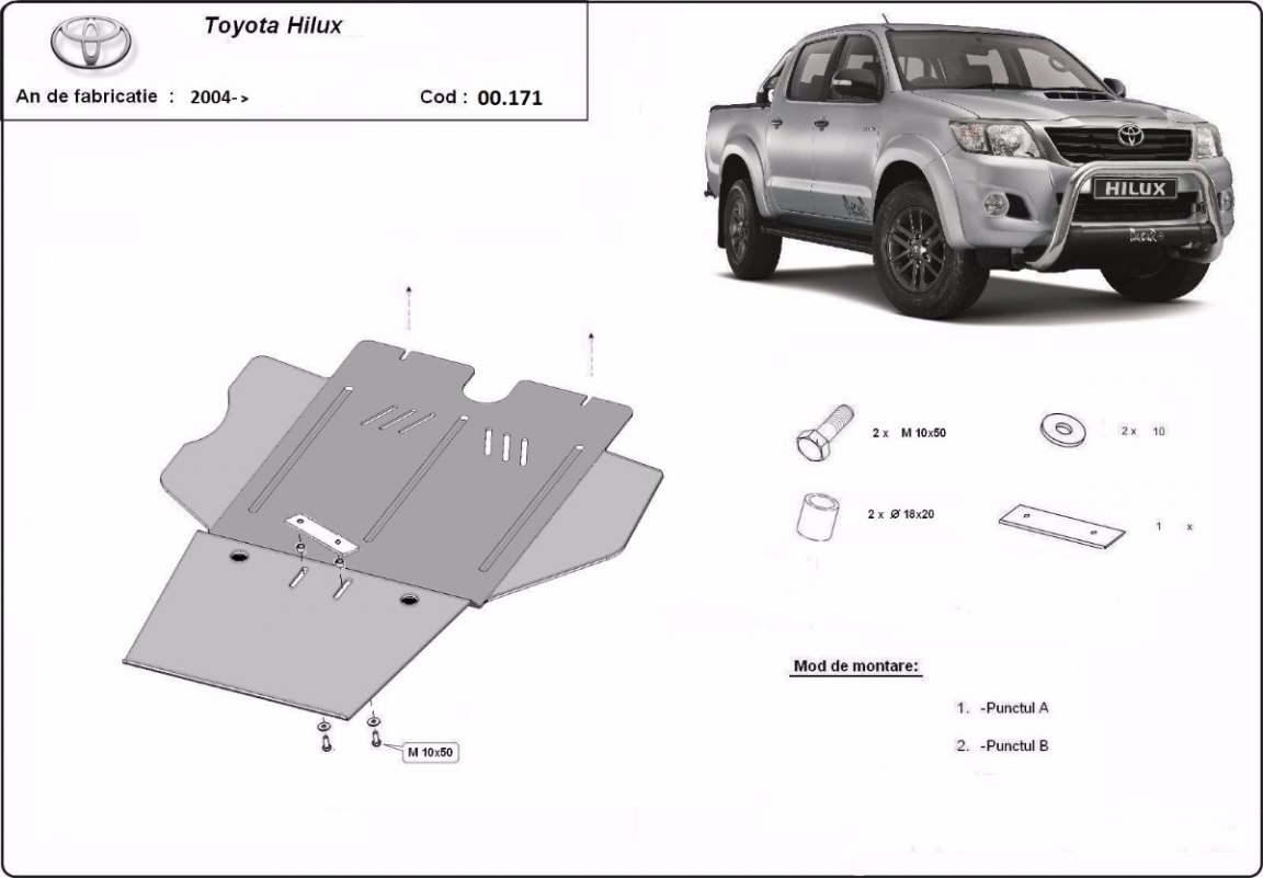 Die Abschirmung schützt: getriebe, differential, DPF , Partikelfilter Toyota Hilux - 2004 und 2015. Der Unterfahrschutz ist neu und passt perfekt für alle Toyota Hilux versionen, die zwischen 2004 und 2015 hergestellt wurden. Aus Stahlblech angefertigt mit einer Stärke von 3 mm. Schrauben, Mutter, Klips - alle Befestigungszubehör sind im Lieferung enthalten. Um mehr Schutz zu bieten gegen Korrosion wird der Unterfahrschutz elektrostatisch besprüht (Pulverbeschichtet) und bei 200o eingebrannt bzw. getrocknet. |