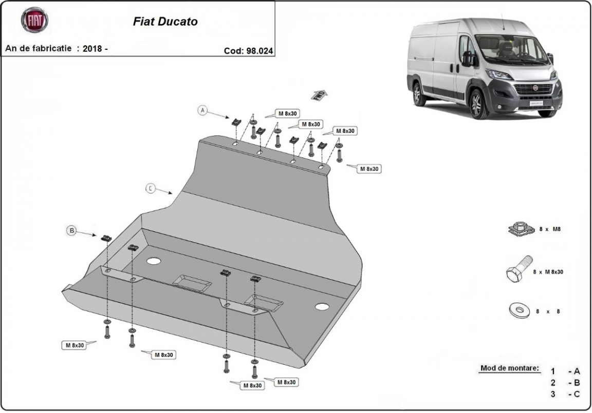 Die Abschirmung schützt: treibstofftank Fiat Ducato - 2018 und 2026. Der Unterfahrschutz ist neu und passt perfekt für alle Fiat Ducato versionen, die zwischen 2018 und 2026 hergestellt wurden. Aus Stahlblech angefertigt mit einer Stärke von 2 mm. Schrauben, Mutter, Klips - alle Befestigungszubehör sind im Lieferung enthalten. Um mehr Schutz zu bieten gegen Korrosion wird der Unterfahrschutz elektrostatisch besprüht (Pulverbeschichtet) und bei 200o eingebrannt bzw. getrocknet. |