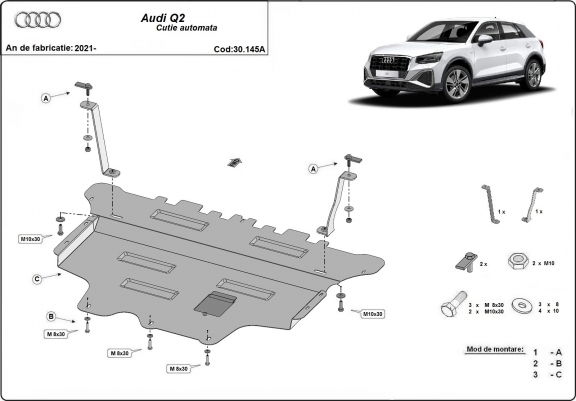 Die Abschirmung schützt: motor, getriebe, kühler, vordere stossfänger Audi Q2 - 2021 und 2026. Der Unterfahrschutz ist neu und passt perfekt für alle Audi Q2 versionen, die zwischen 2021 und 2026 hergestellt wurden. Aus Stahlblech angefertigt mit einer Stärke von 2 mm. Schrauben, Mutter, Klips - alle Befestigungszubehör sind im Lieferung enthalten. Um mehr Schutz zu bieten gegen Korrosion wird der Unterfahrschutz elektrostatisch besprüht (Pulverbeschichtet) und bei 200o eingebrannt bzw. getrocknet. |