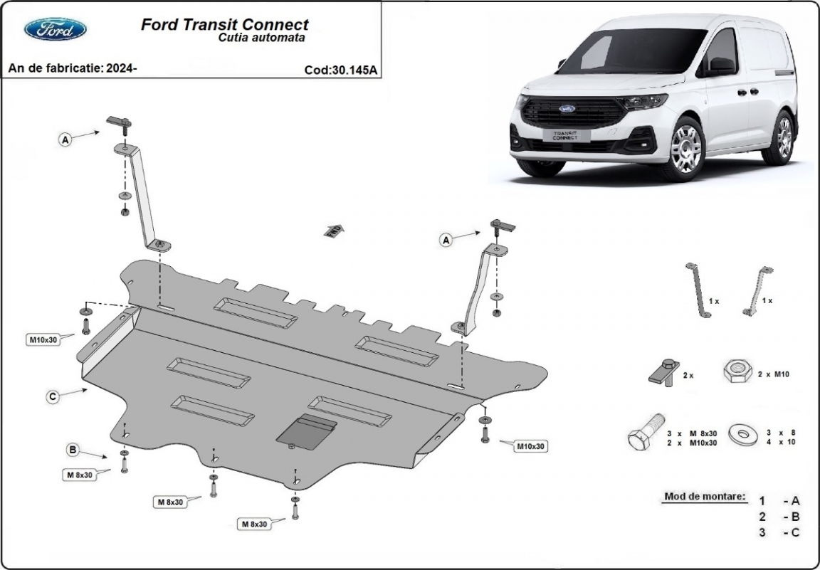 Die Abschirmung schützt: motor, getriebe, kühler, vordere stossfänger Ford Transit Connect - 2024 und 2026. Der Unterfahrschutz ist neu und passt perfekt für alle Ford Transit Connect versionen, die zwischen 2024 und 2026 hergestellt wurden. Aus Stahlblech angefertigt mit einer Stärke von 2 mm. Schrauben, Mutter, Klips - alle Befestigungszubehör sind im Lieferung enthalten. Um mehr Schutz zu bieten gegen Korrosion wird der Unterfahrschutz elektrostatisch besprüht (Pulverbeschichtet) und bei 200o eingebrannt bzw. getrocknet. |