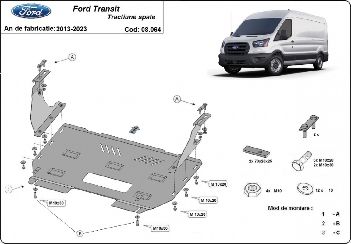 Die Abschirmung schützt: motor, getriebe, kühler Ford Transit - RWD - 2013 und 2023. Der Unterfahrschutz ist neu und passt perfekt für alle Ford Transit - RWD versionen, die zwischen 2013 und 2023 hergestellt wurden. Aus Stahlblech angefertigt mit einer Stärke von 2.5 mm. Schrauben, Mutter, Klips - alle Befestigungszubehör sind im Lieferung enthalten. Um mehr Schutz zu bieten gegen Korrosion wird der Unterfahrschutz elektrostatisch besprüht (Pulverbeschichtet) und bei 200o eingebrannt bzw. getrocknet. |