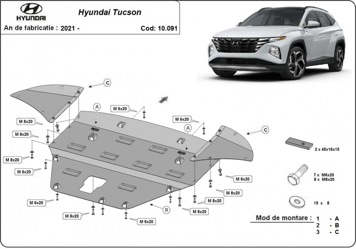 Die Abschirmung schützt: motor, getriebe, kühler, vordere stossfänger Hyundai Tucson - 2021 und 2026. Der Unterfahrschutz ist neu und passt perfekt für alle Hyundai Tucson versionen, die zwischen 2021 und 2026 hergestellt wurden. Aus Stahlblech angefertigt mit einer Stärke von 2 mm. Schrauben, Mutter, Klips - alle Befestigungszubehör sind im Lieferung enthalten. Um mehr Schutz zu bieten gegen Korrosion wird der Unterfahrschutz elektrostatisch besprüht (Pulverbeschichtet) und bei 200o eingebrannt bzw. getrocknet. |
