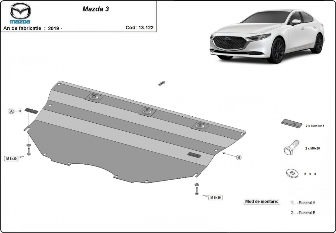 Die Abschirmung schützt: motor, getriebe Mazda 3 - 2019 und 2026. Der Unterfahrschutz ist neu und passt perfekt für alle Mazda 3 versionen, die zwischen 2019 und 2026 hergestellt wurden. Aus Stahlblech angefertigt mit einer Stärke von 2 mm. Schrauben, Mutter, Klips - alle Befestigungszubehör sind im Lieferung enthalten. Um mehr Schutz zu bieten gegen Korrosion wird der Unterfahrschutz elektrostatisch besprüht (Pulverbeschichtet) und bei 200o eingebrannt bzw. getrocknet. |