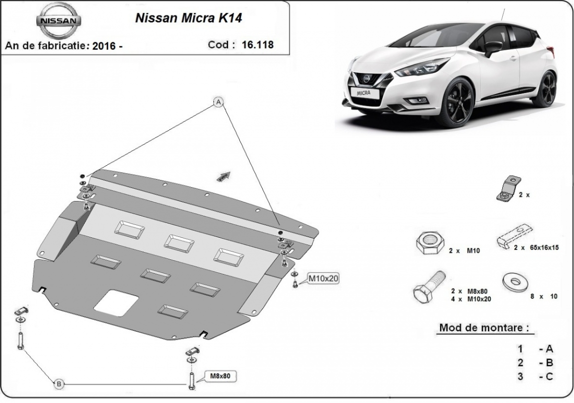 Die Abschirmung schützt: motor, getriebe, kühler Nissan Micra - 2016 und 2026. Der Unterfahrschutz ist neu und passt perfekt für alle Nissan Micra versionen, die zwischen 2016 und 2026 hergestellt wurden. Aus Stahlblech angefertigt mit einer Stärke von 2 mm. Schrauben, Mutter, Klips - alle Befestigungszubehör sind im Lieferung enthalten. Um mehr Schutz zu bieten gegen Korrosion wird der Unterfahrschutz elektrostatisch besprüht (Pulverbeschichtet) und bei 200o eingebrannt bzw. getrocknet. |