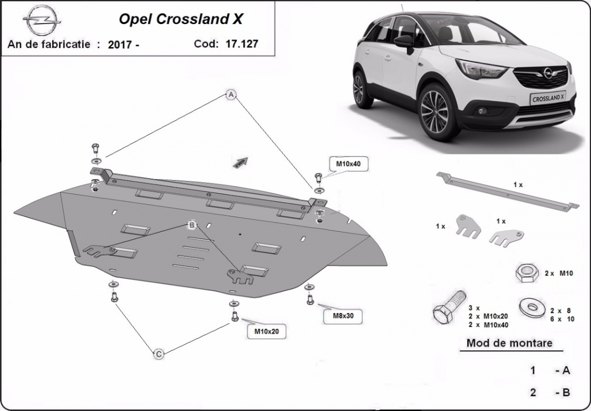 Die Abschirmung schützt: motor, getriebe, kühler, vordere stossfänger Opel Crossland X - 2017 und 2026. Der Unterfahrschutz ist neu und passt perfekt für alle Opel Crossland X versionen, die zwischen 2017 und 2026 hergestellt wurden. Aus Stahlblech angefertigt mit einer Stärke von 2 mm. Schrauben, Mutter, Klips - alle Befestigungszubehör sind im Lieferung enthalten. Um mehr Schutz zu bieten gegen Korrosion wird der Unterfahrschutz elektrostatisch besprüht (Pulverbeschichtet) und bei 200o eingebrannt bzw. getrocknet. |