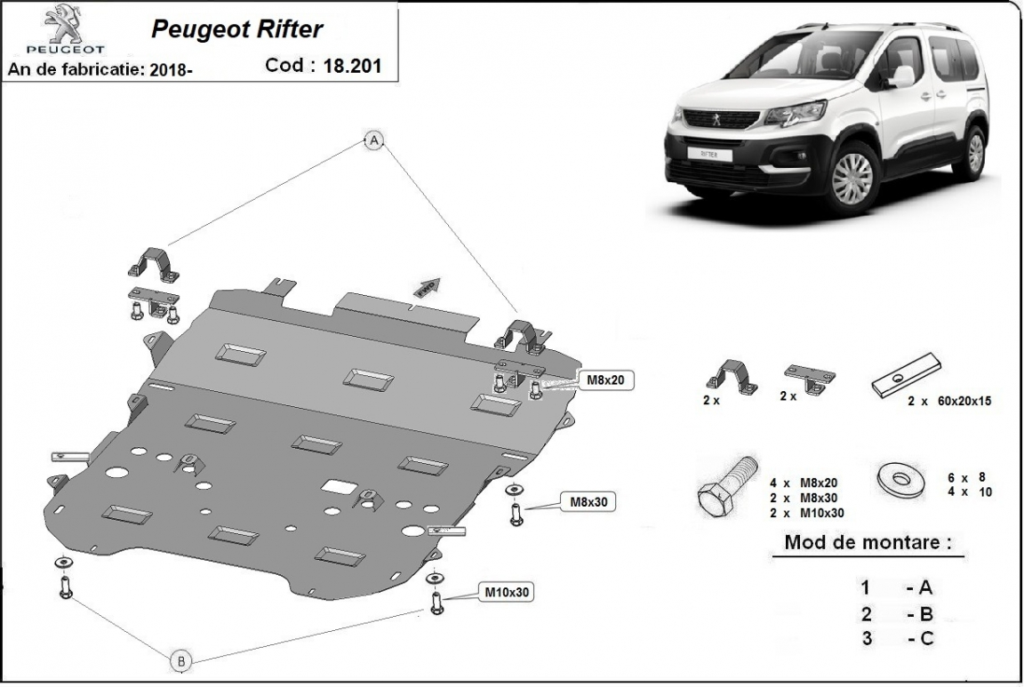 Die Abschirmung schützt: motor, getriebe, kühler, vordere stossfänger Peugeot Rifter - 2018 und 2026. Der Unterfahrschutz ist neu und passt perfekt für alle Peugeot Rifter versionen, die zwischen 2018 und 2026 hergestellt wurden. Aus Stahlblech angefertigt mit einer Stärke von 2 mm. Schrauben, Mutter, Klips - alle Befestigungszubehör sind im Lieferung enthalten. Um mehr Schutz zu bieten gegen Korrosion wird der Unterfahrschutz elektrostatisch besprüht (Pulverbeschichtet) und bei 200o eingebrannt bzw. getrocknet. |