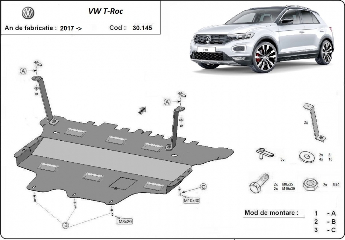 Die Abschirmung schützt: motor, getriebe, kühler, vordere stossfänger Volkswagen T-Roc - 2017 und 2026. Der Unterfahrschutz ist neu und passt perfekt für alle Volkswagen T-Roc versionen, die zwischen 2017 und 2026 hergestellt wurden. Aus Stahlblech angefertigt mit einer Stärke von 2 mm. Schrauben, Mutter, Klips - alle Befestigungszubehör sind im Lieferung enthalten. Um mehr Schutz zu bieten gegen Korrosion wird der Unterfahrschutz elektrostatisch besprüht (Pulverbeschichtet) und bei 200o eingebrannt bzw. getrocknet. |