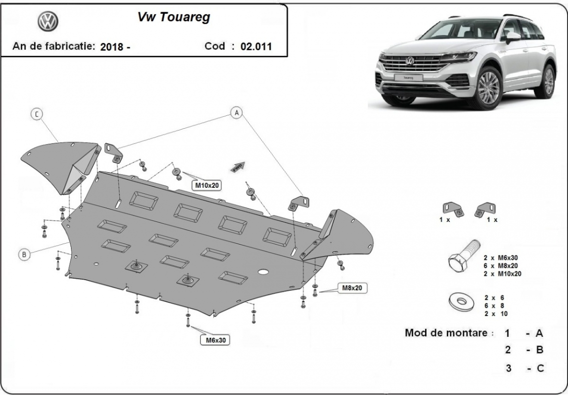Die Abschirmung schützt: motor, kühler, vordere stossfänger Volkswagen Touareg - 2018 und 2026. Der Unterfahrschutz ist neu und passt perfekt für alle Volkswagen Touareg versionen, die zwischen 2018 und 2026 hergestellt wurden. Aus Stahlblech angefertigt mit einer Stärke von 2 mm. Schrauben, Mutter, Klips - alle Befestigungszubehör sind im Lieferung enthalten. Um mehr Schutz zu bieten gegen Korrosion wird der Unterfahrschutz elektrostatisch besprüht (Pulverbeschichtet) und bei 200o eingebrannt bzw. getrocknet. |